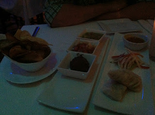 We decided to do a lot of tapas, since the place is famous for it. We ordered the Latin Trio with wasabi guacamole, black bean hummus and pineapple pico de gallo served on fresh yuca and boniato chips. Then the Langosta Tostadas with - get ready for this - fresh caribbean lobster and shrimp, chile de arbor, lime aoili, truffled arugula, red onion and jalapeƱo, bacon and queso blanco crumbles, house-made cilantro, all topped on corn tostada. And the Calamari Tamari with tempura calamari and cherry peppers, red onions, cucumbers, tomatoes, tamarind-lime and zest emulsion (whatever that means). And finally the Shiitake Spring Roll with ginger smoked shiitake and exotic mushroom spring roll, crispy shallots, and Caribbean fruit chutney. We didn't end up ordering any Entradas (entrees), or anything that the waiter recommended. But that's okay.